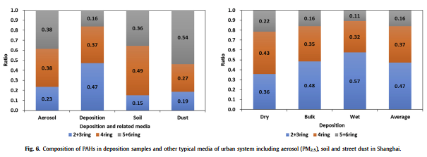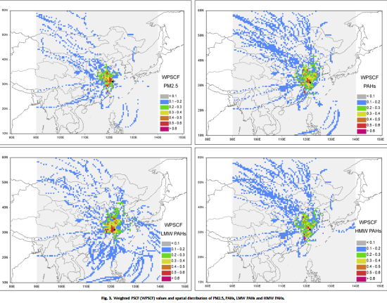 3.围绕通过光解校正和考虑不同气象条件,对大气颗粒物多环芳烃(PAHs)的排放来源进行优化解析和动态解析,揭示了其在静稳天气条件下更多地来源于本地排放累积的规律。运用各类空间析源模型,对大气颗粒物PAHs来源进行空间辨识和定量估算。结果表明,对上海市大气颗粒物PAHs浓度贡献较大的区域集中在长三角和环渤海地区;且低分子量PAHs区域传输模式与高分子量PAHs有所不同,其方向性不明显。