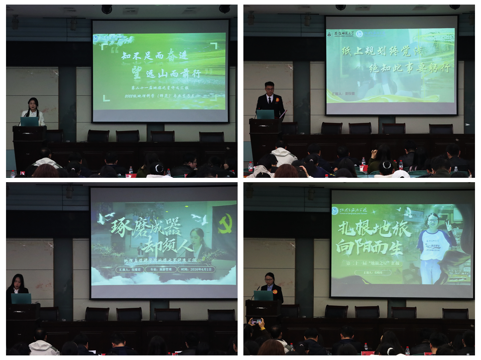 评审组依据申报材料直接评审产生,本次现场汇报环节为“地旅之星”十佳大学生的汇报展示。经各班级团支部择优推荐、51吃瓜网