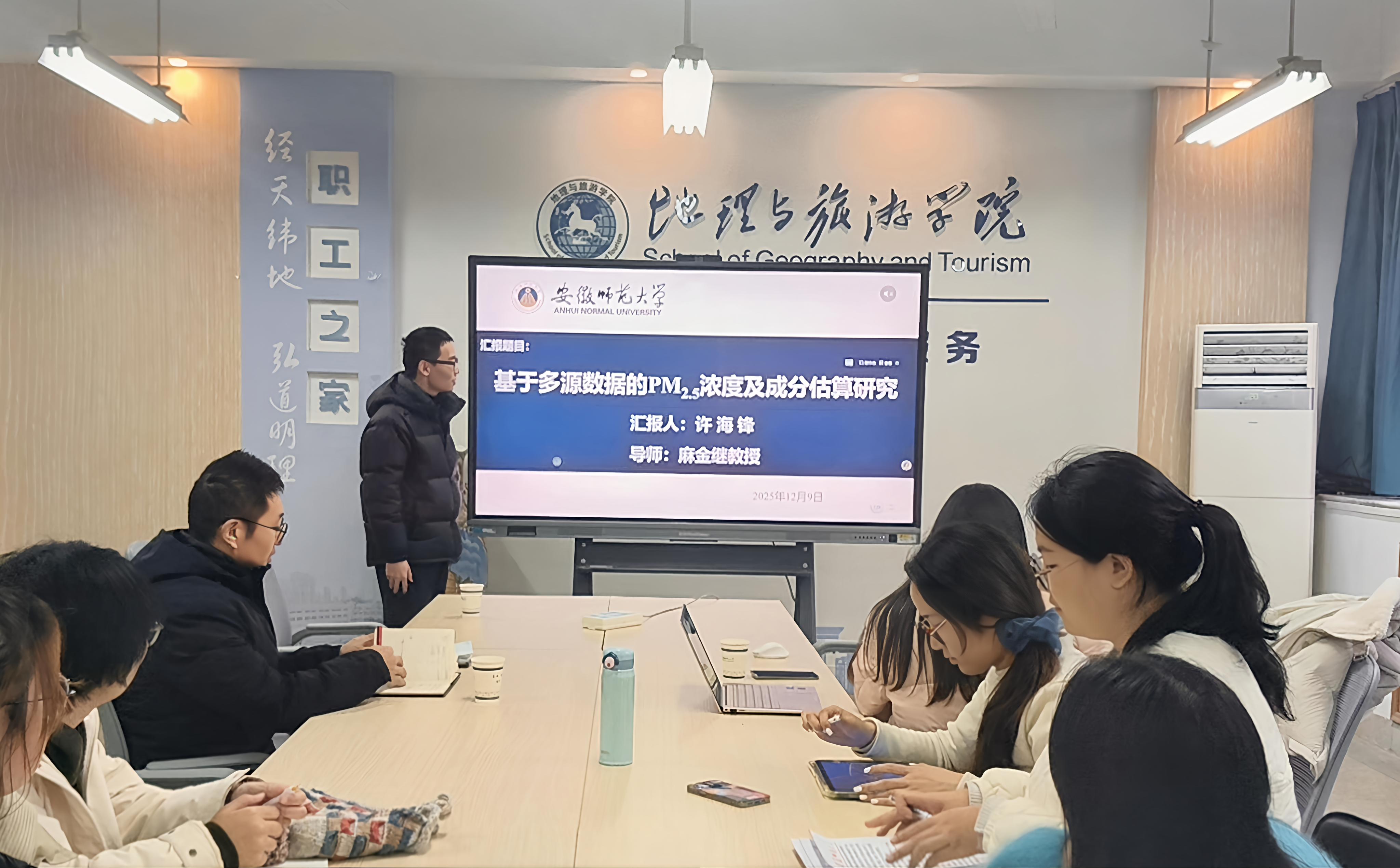 在学术报告环节,博士研究生许海锋作《基于多源数据的PM2.5浓度及成分估算研究》专题报告。他综合运用多源数据,构建了PM2.5浓度及其化学成分的估算模型,为大气污染研究和环境治理提供了新的方法论支持。