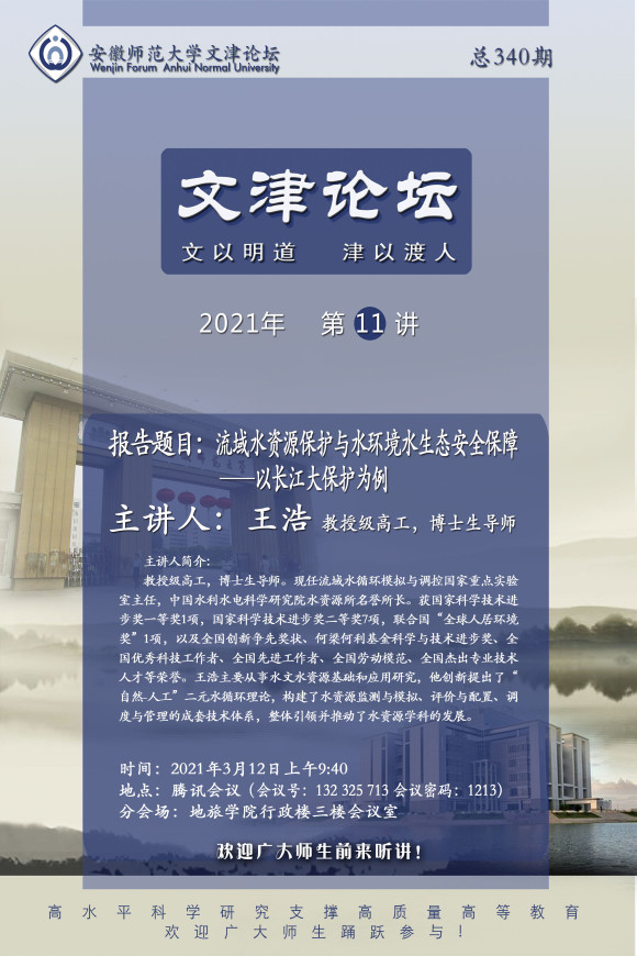 【学术预告】王浩:流域水资源保护与水环境水生态安全保障——以长江大保护为例